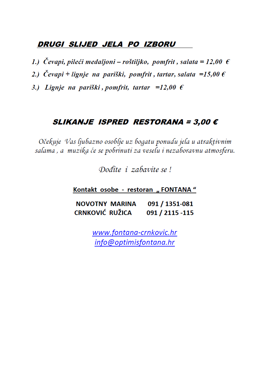 Nudimo vrhunsku muziku koja će oživjeti pravog plesača u Vama, profesionalno slikanje kako biste očuvali vječnu uspomenu te ono najvažnije ukusnu i domaću hranu u kojoj će svi uživati! ![]()